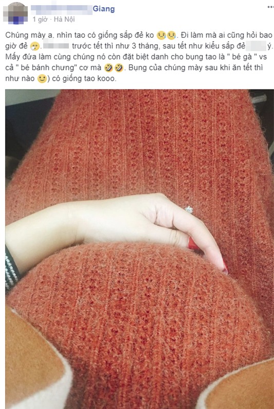 "Nhìn tao có giống sắp đẻ không? Đi làm mà ai cũng hỏi bao giờ đẻ. Trước Tết thì như 3 tháng, sau Tết thì như kiểu sắp đẻ ấy. Mấy đứa cùng làm còn đặt biệt danh cho bụng tao là "bé gà" với "bé bánh chưng" cơ mà. Bụng của chúng mày sau khi ăn Tết thì như nào? Có giống tao không"?