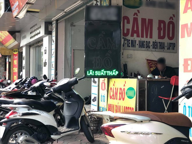 Các tiệm cầm đồ chật ních xe máy, xếp tràn cả trên vỉa hè từ tay ga đến xe số, chưa kể vô số điện thoại và laptop trong tủ kính.
