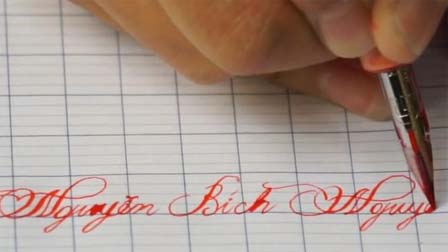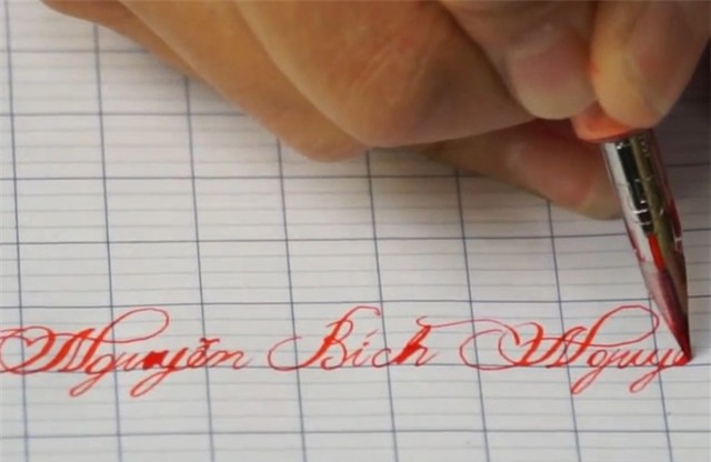 Theo cô Nguyệt, ngược 360 độ là kiểu viết khó nhất, bởi cấu tạo của chiếc bút nét thanh nét đậm đã bị đảo ngược hoàn toàn. Không chỉ viết như thói quen, cô giáo trẻ phải tính toán, tư duy và hoàn toàn tập trung vào nét bút.