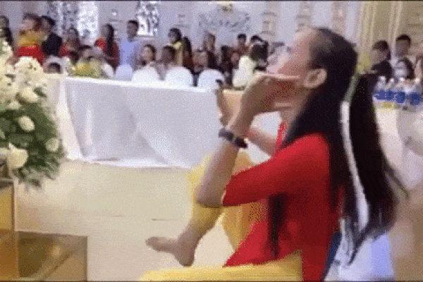Khi các cháu biểu diễn trên sân khấu thì cô giáo trẻ ngồi bên dưới để "nhắc bài", dáng vẻ hết sức nhiệt tình và nhập tâm. Hành động dễ thương của cô giáo này khiến nhiều người thích thú, dành tặng nhiều lời khen ngợi.