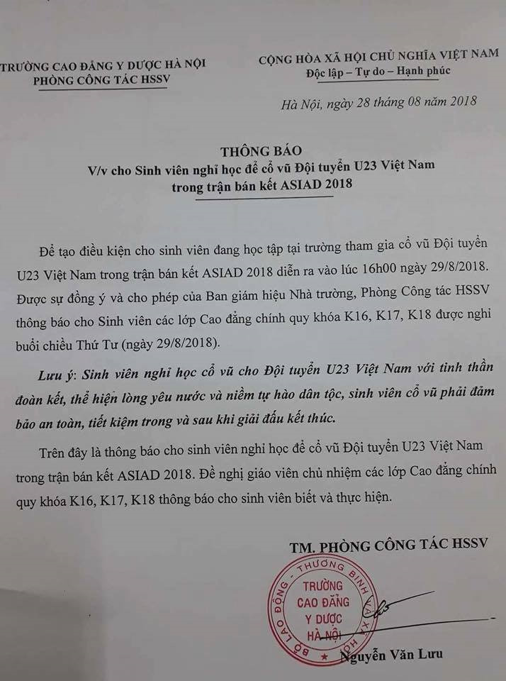 Cao đẳng Y Dược Hà Nội vừa có thông báo cho sinh viên nghỉ học để cổ vũ đội tuyển Olympic Việt Nam thi đấu với Olympic Hàn Quốc chiều nay. Nhà trường cũng lưu ý sinh viên nghỉ học cổ vũ bóng đá với tinh thần đoàn kết, thể hiện lòng yêu nước và niềm tự hào dân tộc. Sinh viên cổ vũ phải đảm bảo an toàn, tiết kiệm trong và sau khi giải đấu kết thúc.