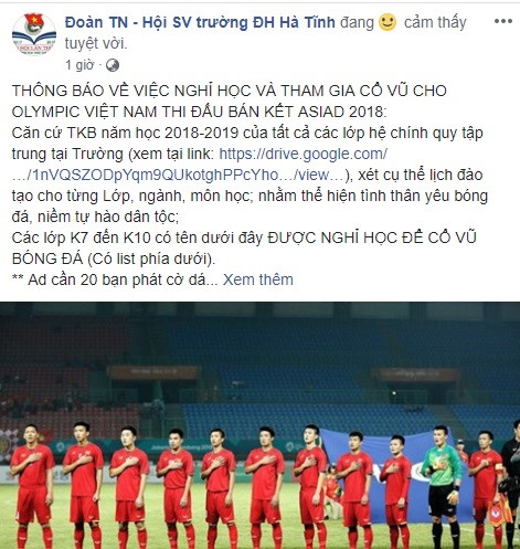 Hội sinh viên ĐH Hà Tĩnh thông báo danh sách 24 lớp học được nghỉ chiều 29/8 để xem đá bóng. Đoàn trường tặng 1.000 cờ dán má cho sinh viên.