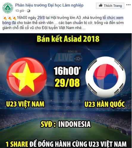 ĐH Nông Lâm Bắc Giang thông báo sẽ tổ chức xem đá bóng tại hội trường lớn B5. Sinh viên có thể theo dõi Olympic Việt Nam đá bán kết ASIAD 2018 với Olympic Hàn Quốc qua màn hình lớn.