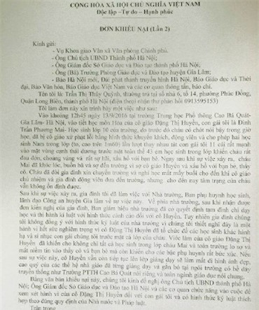 Đơn khiếu nại của phụ huynh em P.M. Ảnh:Infonet. |