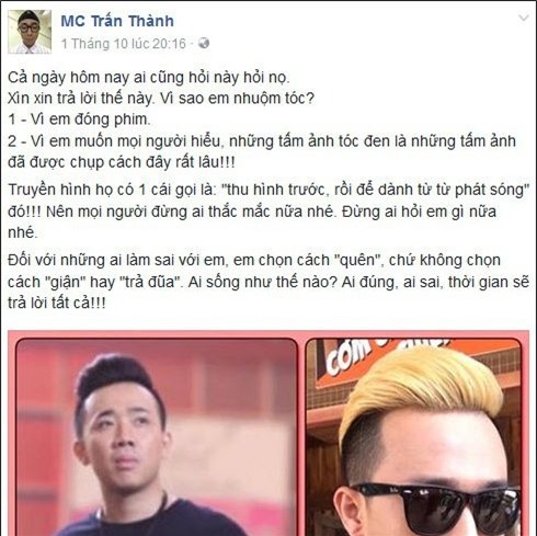Sau đó, phía Hari Won và Trấn Thành chỉ quyết định tiếng ngắn gọn, nhẹ nhàng nhằm phân trần vấn đề chứ không chọn cách đôi co hay “đá xoáy” lại. “MC đắt show nhất Việt Nam” khẳng định đối với những ai làm điều gì sai với anh, anh chọn cách “quên”, thay vì “giận” hoặc “trả đũa”.