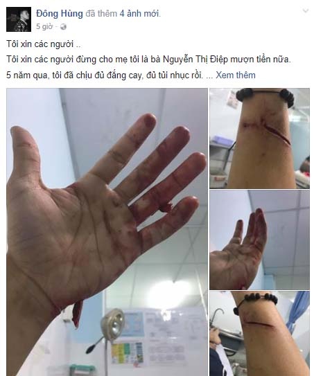 Một trường hợp khác cũng khiến người hâm mộ không khỏi đau lòng đó là nam ca sĩ Đông Hùng bất ngờ đăng hình ảnh cánh tay có nhiều vết chém và thương tích còn đang rỉ máu trên trang cá nhân. Nguyên nhân được nam ca sĩ cho biết là do mẹ ruột thiếu nợ đến nỗi bị chủ nợ tìm đến đòi và hành hung anh. Đông Hùng cũng cầu xin mọi người không được cho mẹ ruột của anh - bà Nguyễn Thị Điệp mượn tiền.