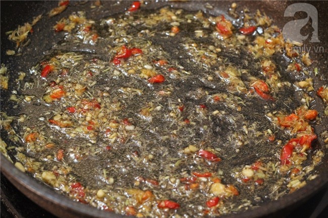 Cho một chút dầu ăn vào chảo, đổ sả xay nhỏ vào đảo đều cho săn lại. Khi sả săn lại và dậy mùi thơm, bạn đổ ớt băm nhỏ vào đảo khoảng 2 phút.