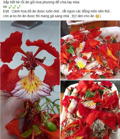 Phương Lan viết, "sắp hết hè rồi làm gỏi hoa phượng để chia tay mùa. Cánh hoa đỏ ăn được luôn nhé, rất ngon nên các đồng môn nên thử. Còn ai không tin ăn được thì mang gà sang nhà mình sẽ dạy".