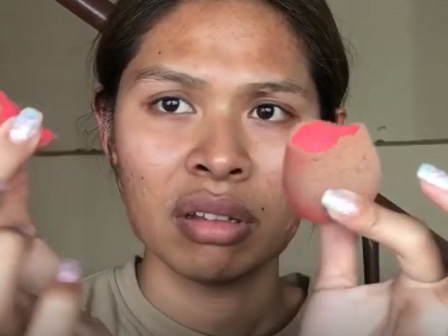 Từ đoạn clip có thể thấy, cô nàng này đã sử dụng chiếc dép tông trong việc xoa nhẵn lớp phấn trên khuôn mặt rồi sau đó giữ chặt gương mặt để kẻ lông mày.