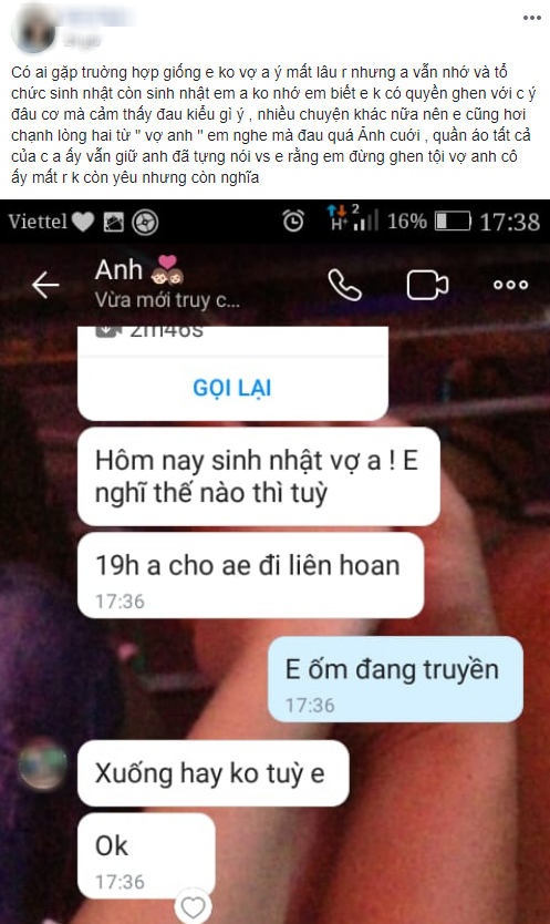 "Vợ anh ý mất lâu rồi nhưng anh vẫn nhớ và tổ chức sinh nhật còn sinh nhật em, anh không nhớ! Em biết em không có quyền ghen với chị ý đâu cơ mà cảm thấy đau kiểu gì ý. Nhiều chuyện khác nữa nên em cũng hơi chạnh lòng hai từ "vợ anh"! Em nghe mà đau quá", cô gái trẻ viết.