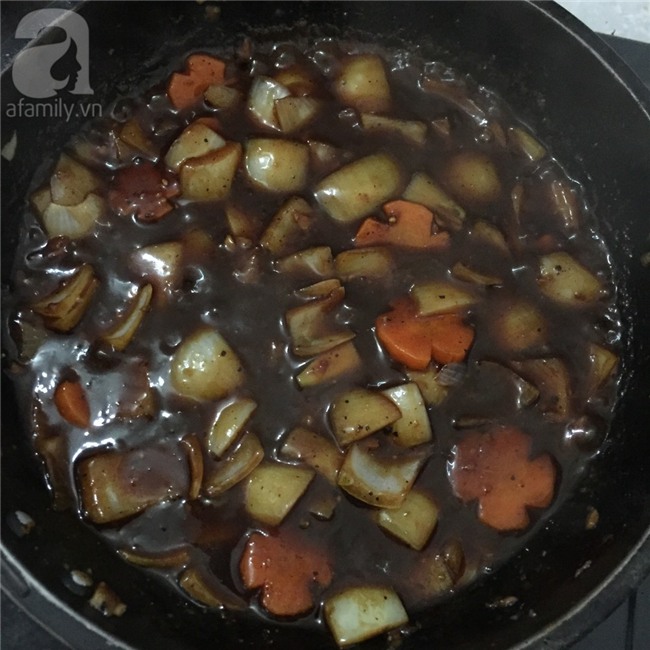 Đổ phần nước sốt vào chảo hành tây, cà rốt. Đun sôi lại thì tắt bếp.