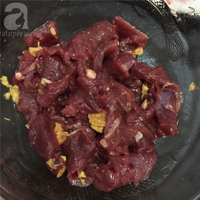 Thịt bò thái miếng mỏng, to bản, ướp với gia vị, gừng, tỏi băm nhỏ cùng 1 chút dầu ăn.