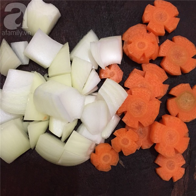 Hành tây thái miếng vuông. Cà rốt tỉa hoa thái miếng dày khoảng 2mm.
