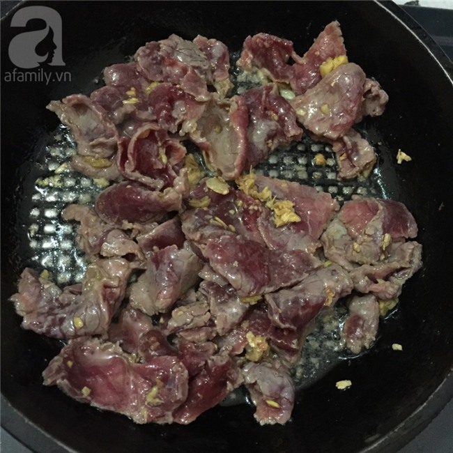 Cho 1 ít dầu vào chảo, khi dầu nóng cho thịt bò vào xào, để lửa to.