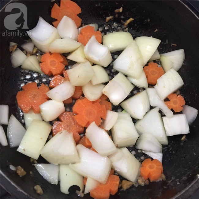 Vẫn trong chảo vừa xào thịt bò, thêm chút dầu ăn rồi cho hành tây cà rốt vào đảo cho chín.
