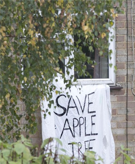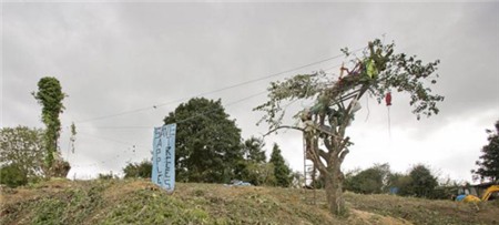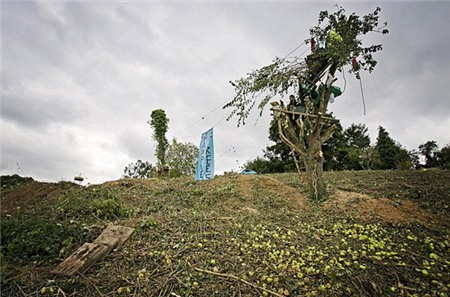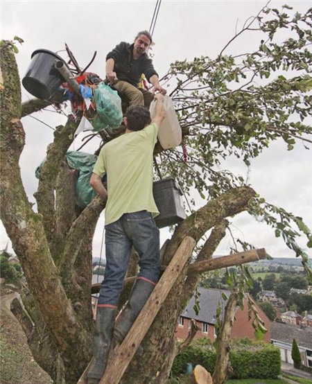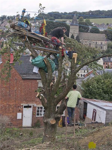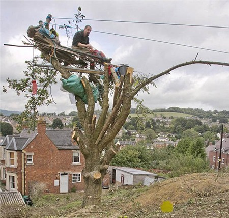 Một người đàn ông ở Stroud – Gloucestershir - Anh đã đem nhiều vật dụng lên cây táo 150 tuổi và “cố thủ” trên đó suốt một tuần liền với mục đích kiên quyết không cho công ty thi công giải phóng mặt bằng chặt cây.
