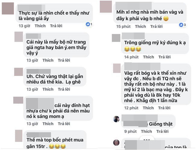 "Nhà tớ bán vàng nên tớ thấy bộ nữ trang này 99% là giả. Nhìn là thấy ngay là mỹ kí rồi. Nếu là vàng thật sẽ không bị xỉn màu như vậy đâu. Chẳng biết là anh chồng bị lừa hay không có tiền nên mua tạm đồ này về tặng vợ nữa", tài khoản D.G.T. chia sẻ.