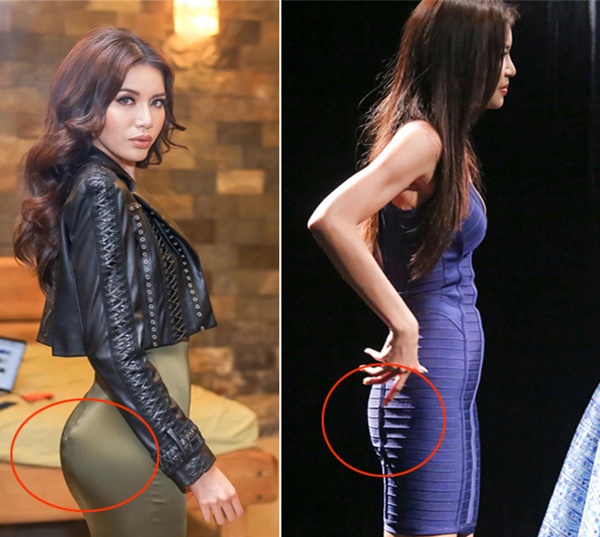 Mai Phương Thúy, Minh Tú... từng là "nạn nhân" của váy ôm sát cơ thể. Họ vô tình bị bắt lại những khoảnh khắc "mất hút vòng 3" gây ngỡ ngàng. Vì Mai Phương Thúy, Minh Tú lần lượt sở hữu số đo vòng 3 ấn tượng là 95cm, 96cm nên cả hai nhiều lần bị nghi ngờ sử dụng phụ tùng quần độn.