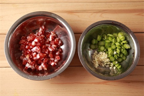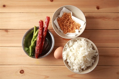 Lạp xưởng thái hạt lựu, ngồng cải thái nhỏ, tỏi băm nhỏ.
