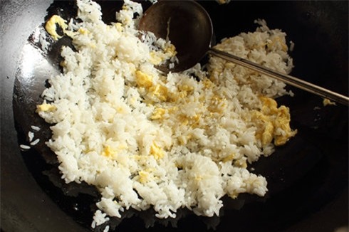 Đun nóng một ít dầu ăn trong chảo, cho trứng vào đánh tơi rồi cho cơm vào đảo nhanh cùng trứng.