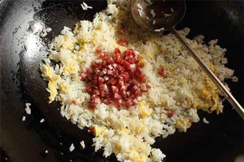 Cơm sau khi chiên khoảng 1 phút thì cho lạp xưởng và đảo khoảng 5 phút cho chín.
