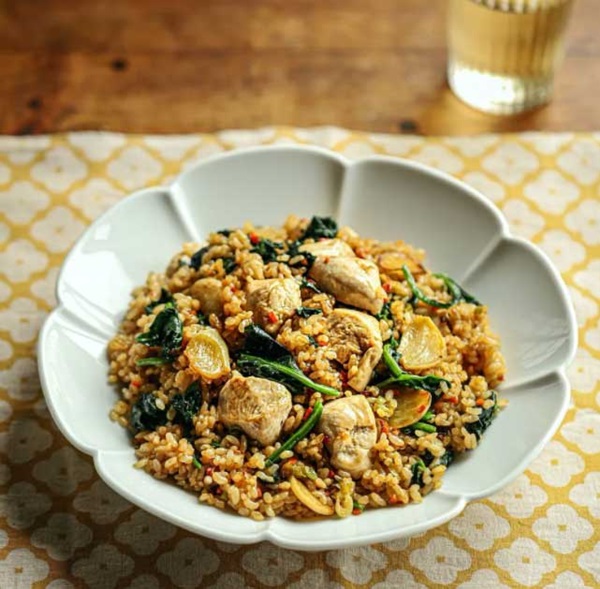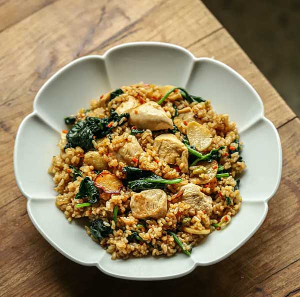 5. Thêm cơm gạo lứt vào rang, cho xì dầu nêm vừa ăn. Cho rau bina vào đảo là xong.