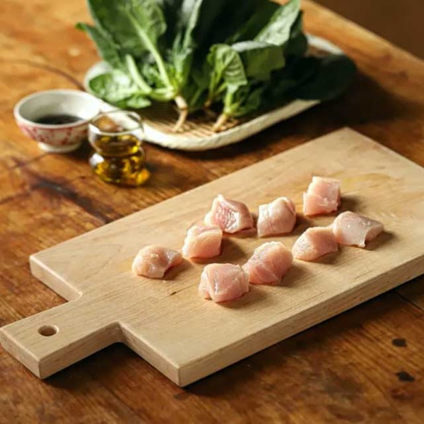 1. Thịt ức gà cắt miếng nhỏ, nêm gia vị vừa ăn.