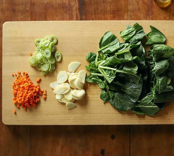 2. Cắt rau bina thành các đoạn dài khoảng 3 cm và cắt tỏi thành từng lát. Thái nhỏ hành lá và cắt cà rốt thành khối vuông nhỏ.
