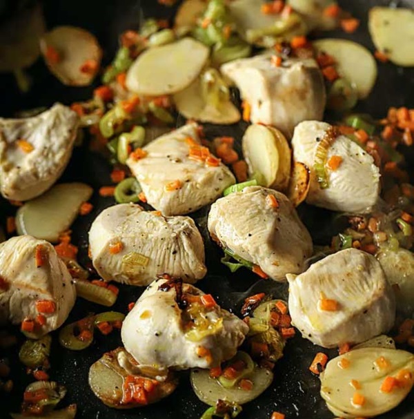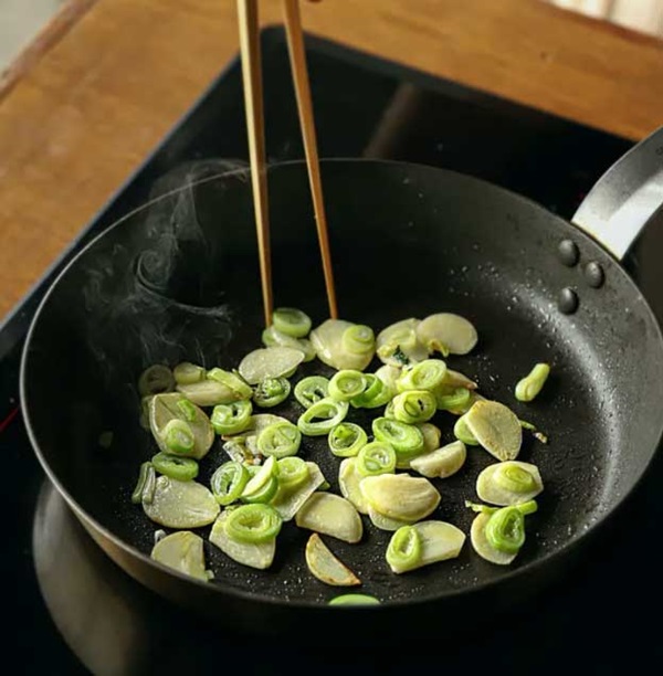 4. Đun nóng dầu trong chảo, cho tỏi và hành lá đã băm nhỏ vào phi thơm, khi chuyển sang màu vàng nâu thì cho cà rốt và ức gà vào xào. Nêm muối và tiêu vào.