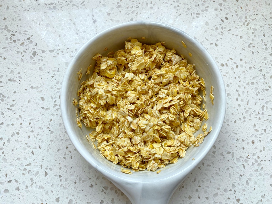 Sau khi trộn đều trứng với yến mạch thì bọc kín bát yến mạch và để yên trong 10 phút cho yến mạch hấp thu toàn bộ trứng.