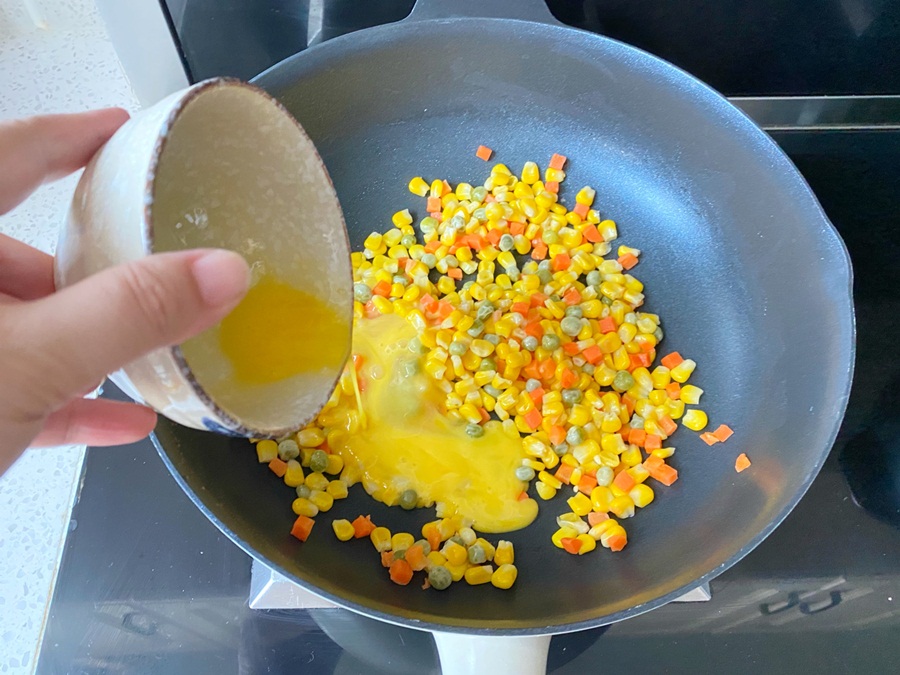 Đánh tan quả trứng còn lại rồi đổ vào chảo rau củ quả, đảo đều cho đến khi trứng đặc lại.