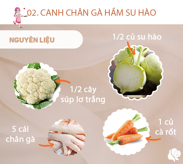 Chuẩn bị: 5 cái chân gà, 1/2 củ su hào, 1 củ cà rốt, 1/2 cây súp lơ, muối vừa ăn.