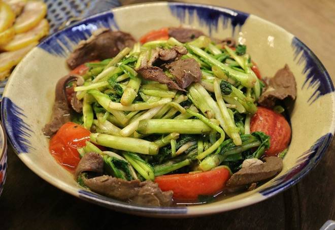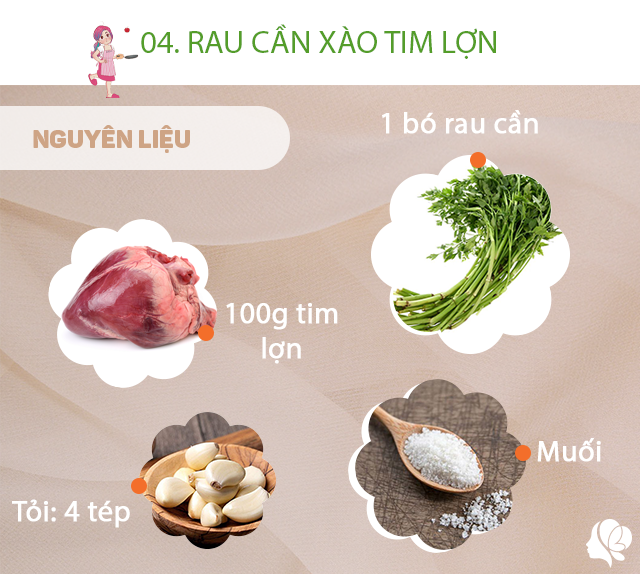 Chuẩn bị: 100g tim lợn, 1 bó rau cần, tỏi, muối.
