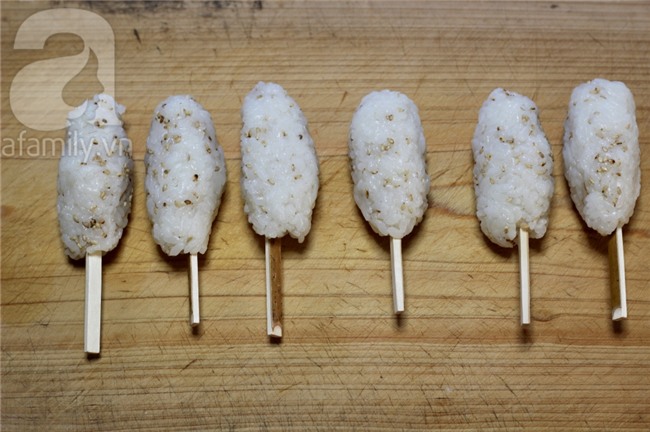 Hâm cơm cho nóng, cho mè vào cơm, trộn đều. Rồi cho khoảng 2 muỗng cơm vào màng bọc thực phẩm. Nắn cơm thành những viên dài, nhỏ to tùy ý. Cho que kem vào giữa viên cơm.