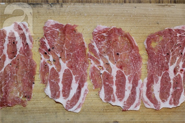 Trải thịt ra thớt, rắc nhẹ ít muối, tiêu cho thấm.