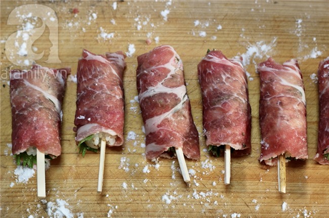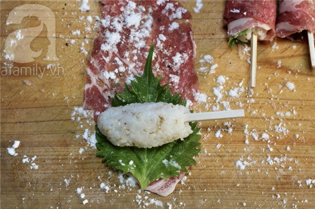 Rắc nhẹ ít bột bắp để tạo độ dính, trải lá tía tô lên thịt, rồi cho viên cơm vào, cuộn lại như cuộn chả giò.