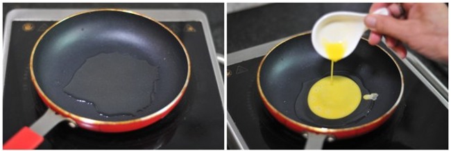 Đun nóng dầu ăn trong chảo, láng đều dầu trên mặt chảo. Múc từng muỗng trứng vào chiên.