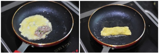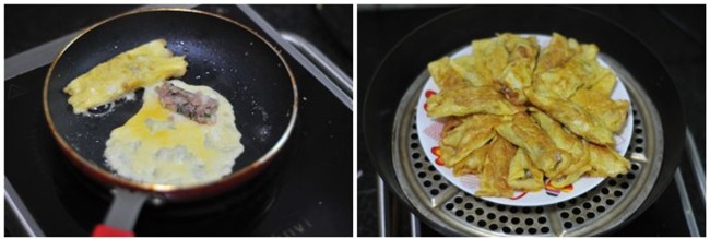 Khi bề mặt trứng se lại thì múc thịt băm đặt lên trên trứng và cuộn lại.