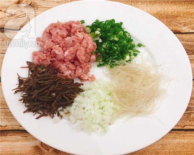 Thịt nạc vai chọn miếng nạc lẫn mỡ, băm hoặc xay nhỏ. Mộc nhĩ ngâm nở, cắt bỏ chân, rửa sạch thái chỉ. Miến dong ngâm sơ, vớt ráo, cắt ngắn. Hành tây cắt hạt lựu. Hành lá thái nhỏ.