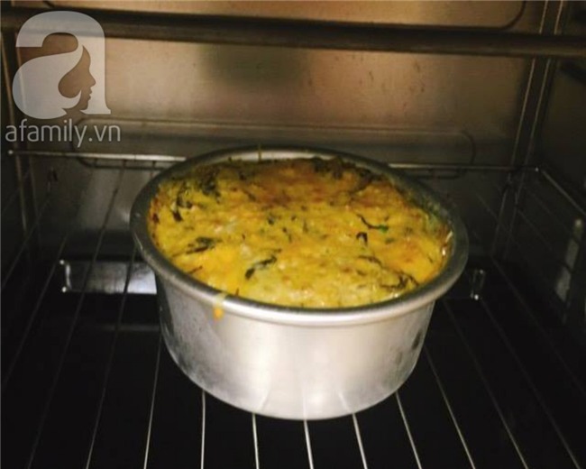 Lấy 1 khuôn nhôm, tráng quanh một lớp dầu cho khỏi dính, cho hỗn hợp vào khuôn. Lưu ý không cho quá đầy vì hỗn hợp sẽ còn nở.