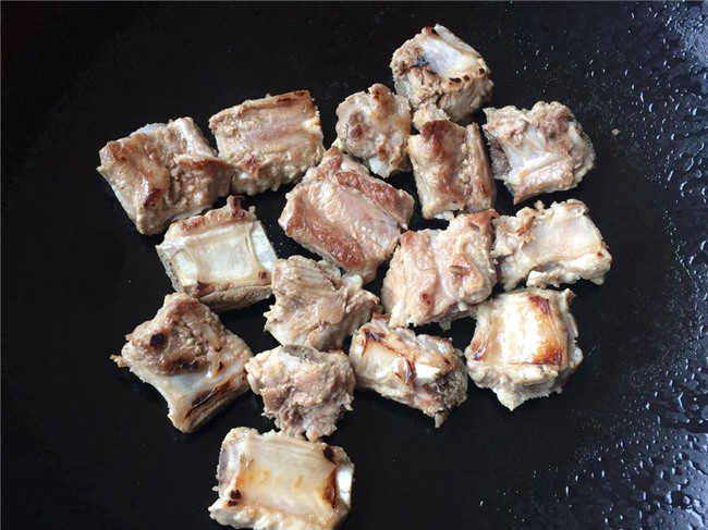 Đun nóng một ít dầu ăn trong chảo, cho sườn vào chiên xém vàng,