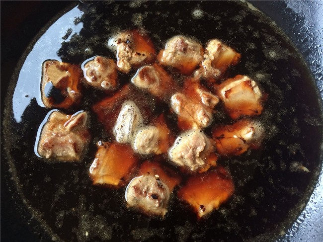 Thêm giấm, đường, nước tương đặc, nước tương nhạt, hạt tiêu, rượu vang vào đảo cho sườn thấm gia vị. Tiếp đó đổ lượng nước ngập mặt sườn, rim cho đến khi sườn chín mềm và nước cạn thì tắt bếp.
