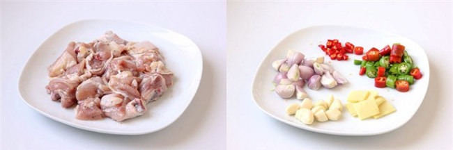 Đùi gà mua về rửa sạch sau đó chặt miếng vừa ăn. Tiếp đến bạn chuẩn bị ớt cắt miếng nhỏ, ớt sừng cắt miếng vừa, gừng cắt lát, hành và tỏi cắt đôi.