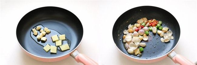 Bắc chảo lên bếp cùng 2 muỗng canh dầu ăn. Khi dầu nóng đều thì bạn cho gừng và tỏi vào phi thơm rồi cho hành, ớt vào đảo đều.