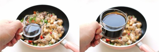 Lúc này bạn cho hỗn hợp rượu gạo, nước mắm, dầu mè, nước tương, muối cùng tiêu xay vào rim cùng gà.
