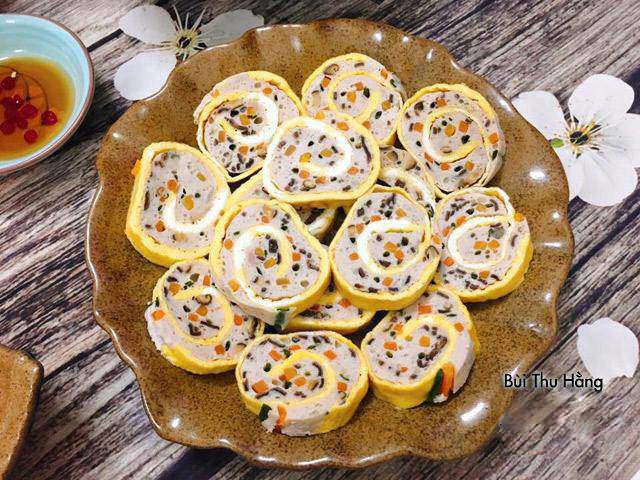 - Giò sống khoảng 1 lạng trộn cùng vài cáu nấm hương, 1 chút mộc nhĩ, 1 cà rốt bé thái nhỏ, hạt tiêu, bột canh. Trải trứng đã tráng lên thớt sạch, dùng thìa phết đều hỗn hợp giò sống lên trên mặt trứng. Dùng tay cuộn lại thành cuộn tròn, bọc giấy trắng hoặc giấy nến bên ngoài, dùng dây cột lại cho khỏi bung ra. Đem hấp cách thuỷ 15 phút, bỏ lớp giấy bọc bên ngoài, thái lát mỏng là được. Món này ăn nóng sẽ ngon hơn nhé.