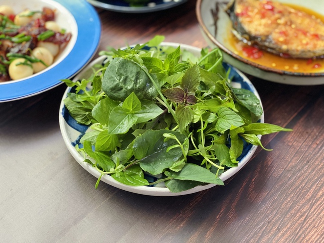Rau sống bạn mua các loại gồm: Rau càng cua, tía tô, diếp cá và kinh giới về rửa sạch, cho vào đĩa. Các loại rau này ăn kèm với món cá thu sốt tỏi ớt rất ngon.