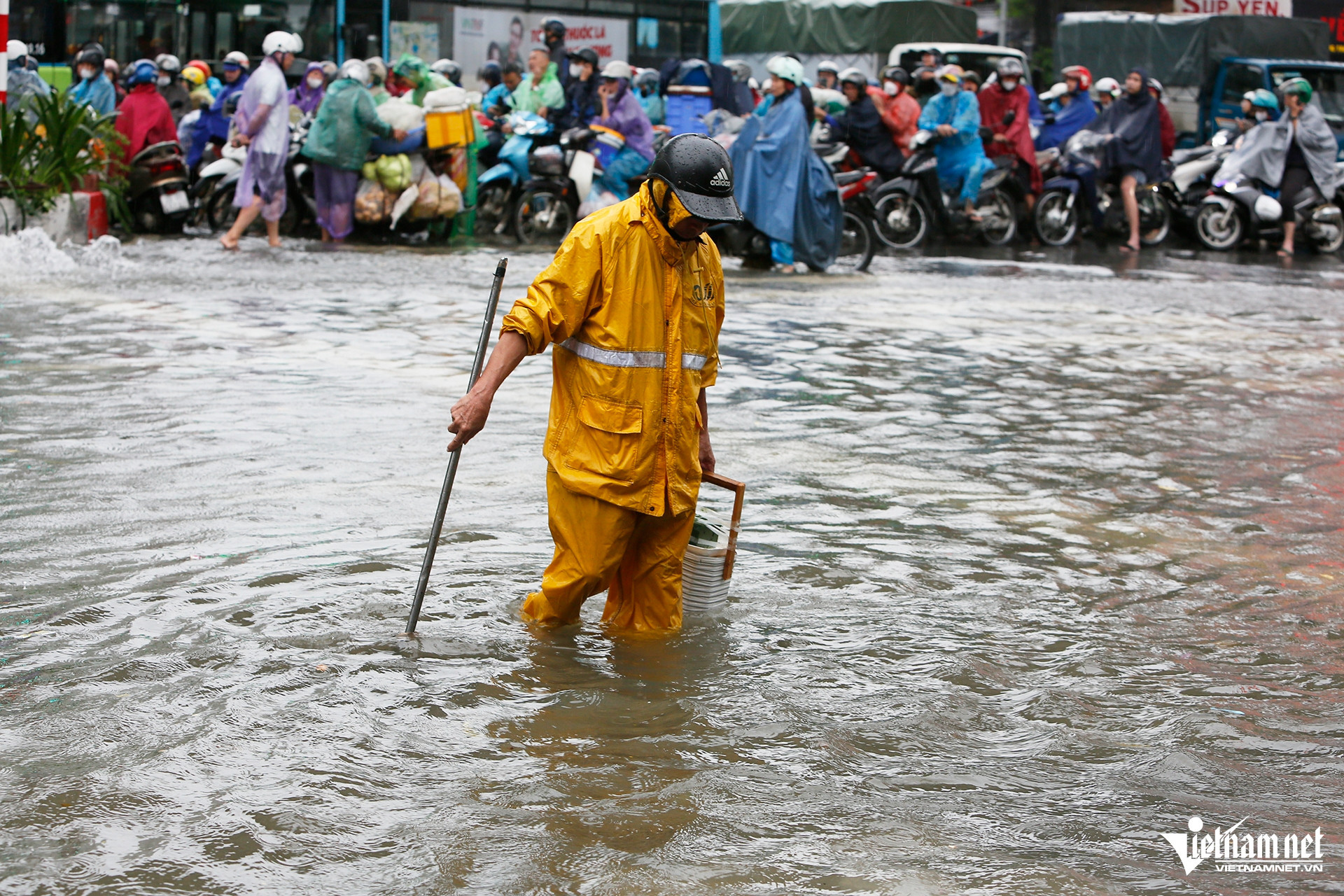 Để thông đường, Công ty TNHH MTV Thoát nước Hà Nội đã cử công nhân cùng phương tiện cơ giới đến để giải quyết điểm ngập sâu.
