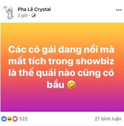 Cụ thể, vào năm 2018, trên trang cá nhân, ca sĩ Pha Lê đã bất ngờ có phát ngôn liên quan tới việc các sao nữ đang nổi mà đột nhiên mất tích là thể nào cũng dính tới bầu bí: "Các cô gái đang nổi mà mất tích trong showbiz là thế quái nào cũng có bầu".