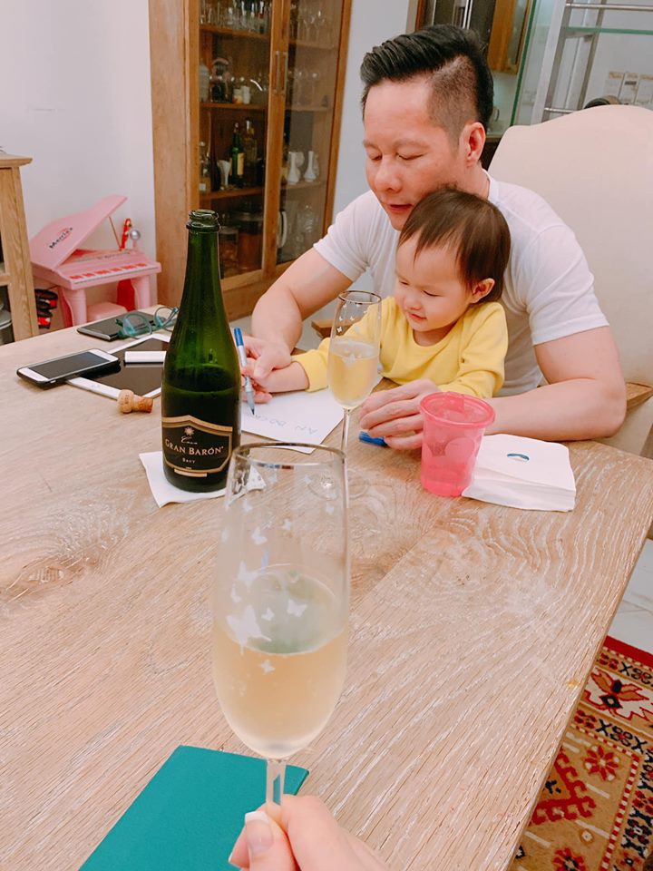 Đại gia Đức An bế con rất khéo, tạo điều kiện hết sức cho vợ vui vẻ với bạn bè.